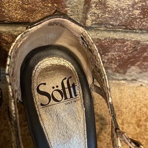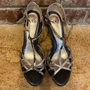 Sofft Women’s gold and brown snakeskin leather Strappy heel sandals. Size 8.5 leather upper, 3.5” heel, see pictures for details.
