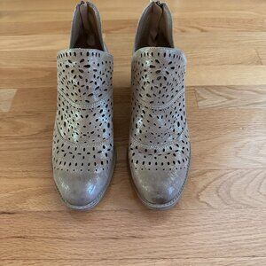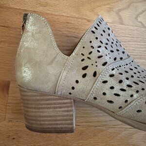 Sofft Wyoming Leather Suede Shimmer Ankle Booties. Perforated design with stacked block heel. Deep V-like sides. Back zipper closure. Cushioned interior. Non-slip soles. Soft suede tan leather with silvery shimmer. Great pre-owned condition, but a few flaws. Both heels, on the inside front, have some of the stacked heel material missing and the white material can be seen (pics 12,13.) It is not noticeable unless closely inspecting the heels. Slight discoloration on the toe area. See the last two pictures. Overall in very clean condition. Size 9M.. Approximate heel height 2".