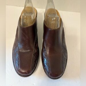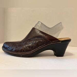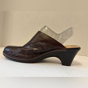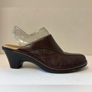 Sofft brown tooled leather black heel clogs mules shoes size 9.5 M