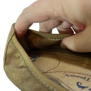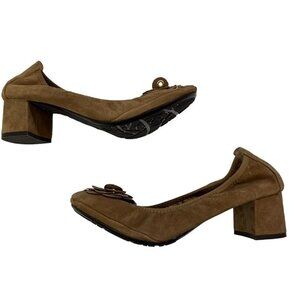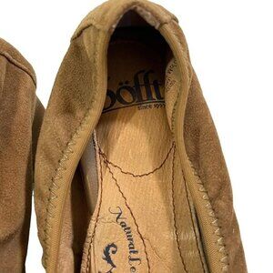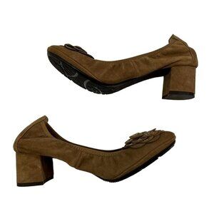 Sofft light brown suede leather heels, ballet flat style with flower on toe