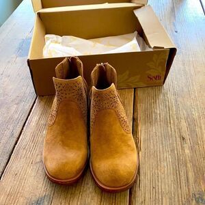 A beautiful suede bootie with eye-catching details! With a striking circle and starburst laser design and split-shaft silhouette, the Barrosa makes a chic statement.