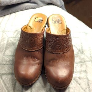 Laser Cut details on this pretty clog. Offered in full-grain leather. Leather comfort footbed. Sculpted one-piece unit with leather binding and accent stitching. Heel Height: 3 1/4 inches with a 3/4 inch platform