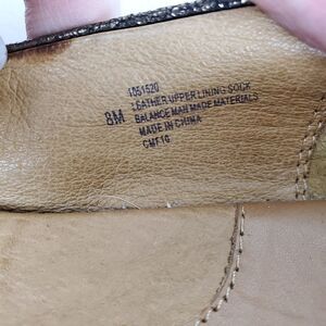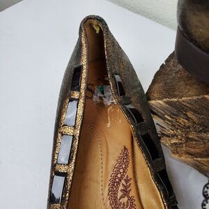 Antiqued crackled gold finish comfort flats with black patent "woven" around trim ending in a decorative bow. Great condition