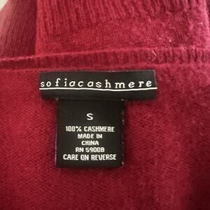 The Sofia 100% Cashmere Sweater in Burgundy Wine is a luxurious and stylish addition to any woman's wardrobe. This long-sleeve sweater features a scoop neckline, tight-knit solid pattern, and raglan sleeves for a modern and classic look. Made from high-quality cashmere fabric, it is lightweight and perfect for all seasons, making it ideal for various occasions including travel, parties, casual outings, and business meetings. With a slim fit and fringe accents, this pullover sweater from the Sofia Cashmere brand exudes a colorful and preppy vibe that is both timeless and elegant. Good used condition no holes or stains 20” pit to pit ; 27” front length; 30” back length