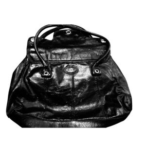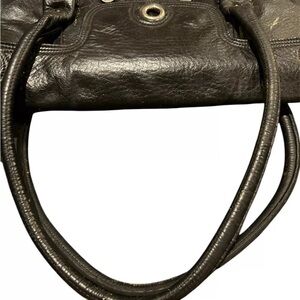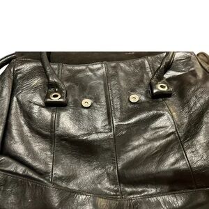 Large handbag with zipper pockets inside, brass snap on buttons with a folding top to close the bag. Large size handles