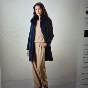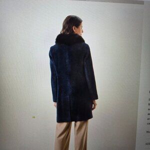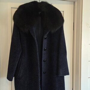 Excellent condition Sofia Cashmere Alpaca Coat. Luxurious and warm. Black fur with dark blue Wool and Alpaca Coat. Love the color as it is dark but not black which shows lint.Three quarter length with room for a sweater.