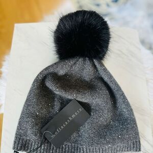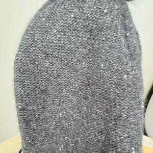 Sofia Cashmere Sequin 100% Cashmere Beanie with Faux Fur Pompom Gray/Black, NWT