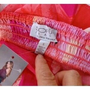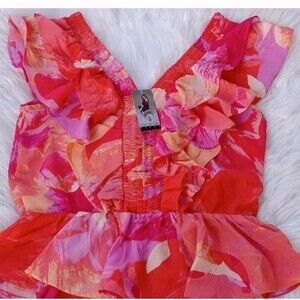 This Sofia Jeans top in size S features a floral pattern with a V-neck and short flutter sleeves. The pullover blouse has smocked detailing and ruffle accents, made of polyester material. Suitable for various occasions like parties, casual wear, or business attire, it embodies a classic fit with a beach theme. Easy to care for with machine washable instructions, this multicolor top is a versatile choice for all seasons.