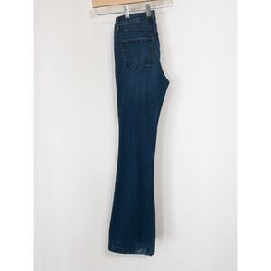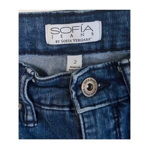 Sofia Jeans by Sofia Vergara Melisa Flare denim in deep blue wash. High-rise with flattering slim fit through thigh and dramatic flare leg for retro-chic style. Soft stretch cotton blend for all-day comfort. A versatile wardrobe essential. Size 2.