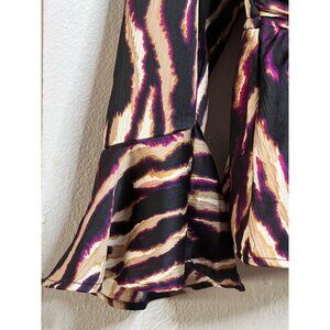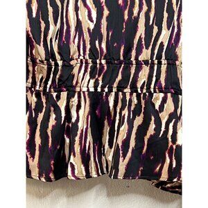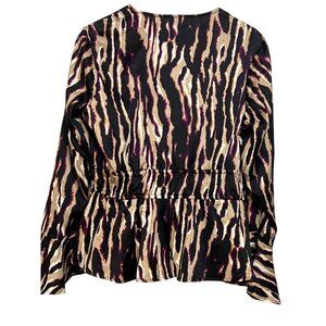 This vibrant wrap peplum top by Sofia Jeans features a bold zebra print in black, beige, and purple. Ideal for adding flair to any wardrobe.