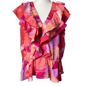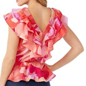 The short flutter sleeves and v-neckline add a touch of femininity, while the printed pattern and peach amber pomona petals color give it a stylish edge.