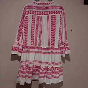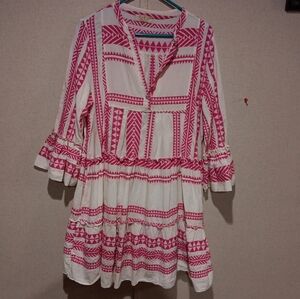 Stylish dress with pink geometric patterns on a white background. Features a relaxed fit and long sleeves.