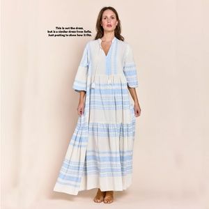 Beautiful bohemian style tiered maxi from Sofia made in Italy. Nice light weight white cotton with turquoise embroidered design. The perfect summer dress – cool and comfortable. The size is OS – so will fit most –except if you're large breasted. See measurements below. I purchased last summer, so only worn/washed a handful of times. Great condition like new.