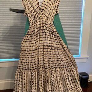 Stunning maxi dress, perfect for any occasion. Crafted with light weight Italian silky satin, feature a flattering V-neckline, cap sleeves, elastic waist and a self tie waist 4 inch wide belt for a customize it. The tiered skirt adds a touch of movement and sophistication making it ideal for both daytime events and evening gatherings. Worn once to a wedding. Cute print, brown with cream colored beans! (Last photo shows dress in chartreuse on model)