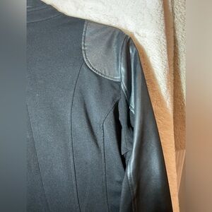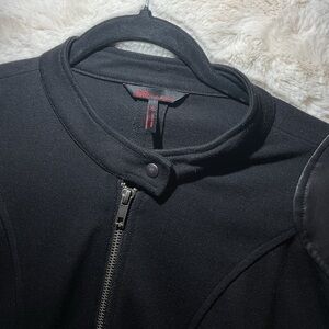 Sofia Vergara Black zipper jacketed. Along the outside sleeve and shoulders it has leather. Stretchy and comfortable material.