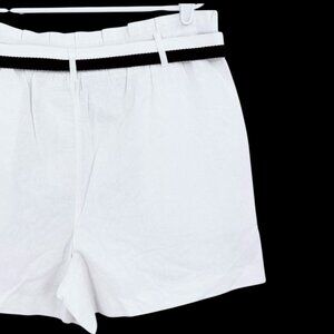 These sophisticated white shorts offer a polished silhouette with a high-rise paperbag design, creating a refined and structured look for professional and casual settings. The linen-rayon blend provides breathable comfort and elegant drape, while the contrasting white/black belt adds a crisp, tailored accent.