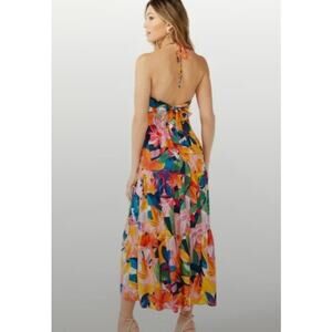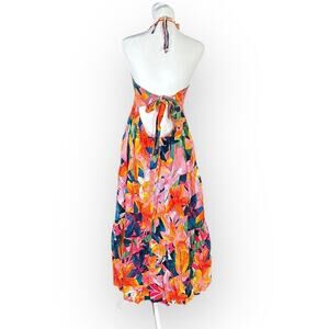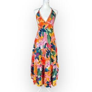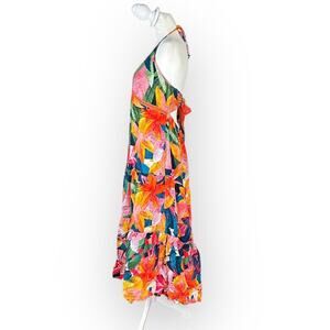 Sofia Vergara Midi Dress Women's XL Orange Blue Floral Halter V-Neck A-Line