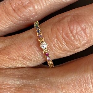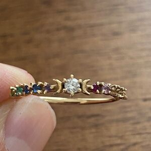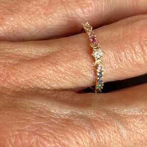 Purchased from Catbird in Brooklyn, NY, a band of rainbow colored stones with a center diamond set between two tiny moons. Great stacking ring.