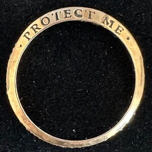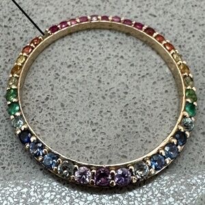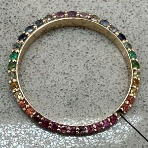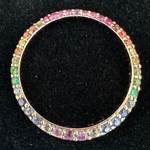 Eternity band set with a rainbow of precious and semiprecious stones including sapphire, emerald, ruby, citrine, amethyst, aquamarine and tsavorite, scaling in size from slightly bigger (purples, blues) to slightly smaller (pinks, reds) all the way around the ring. On the ring's knife edged symmetrical side an oxidized engraving that reads PROTECT ME.