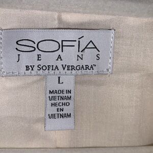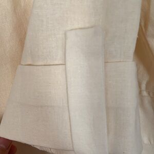 Elegant cream blazer with double-breasted design. Features button closure and front pockets. Perfect for formal occasions.