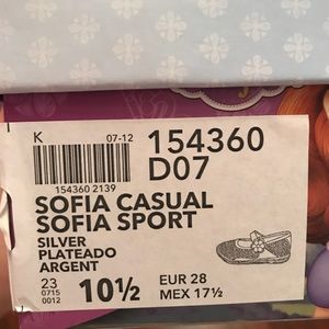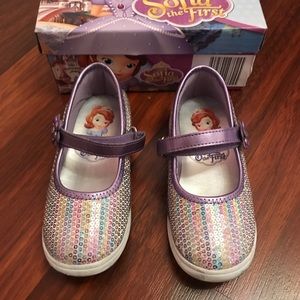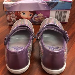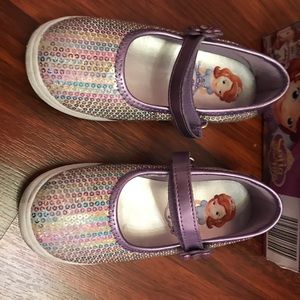 Sofia the First purple sparkle casual sport shoes. Rubber sole. Velcro strap. Flower detail at closure.