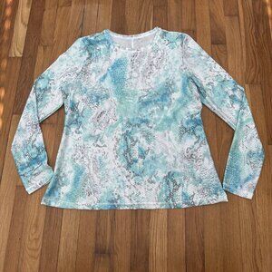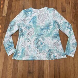 The Sofibella Air Flow Mesh Top in size 1X is a stylish and comfortable activewear piece perfect for tennis, pickleball, walking, and yoga. This green top features a camouflage pattern, long sleeves with a crew neck and pullover closure, and a mesh fabric wash for breathability. Made with a blend of polyester and spandex, this top offers a fitted athletic fit ideal for active women looking for both style and performance in their clothing. Perfect for all seasons, this top is a versatile and practical addition to any active wardrobe.