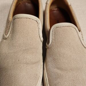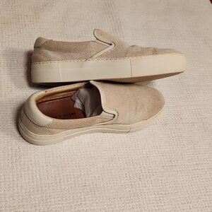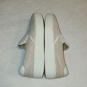 EUC, neutral canvas, leather lining, rubber sole, leather trim, 1.5" platform.