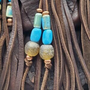 Gorgeous buttery soft leather purse that has leather fringe, copper and turquoise beaded accents and a braided strap. This is all handmade and appears unused. Super clean and amazing. There is one pocket inside.