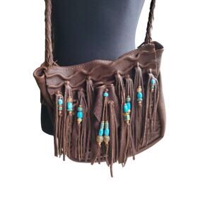 Soft Brown Leather Shoulder Bag Fringe Purse Boho Western Handbag Turquoise SW