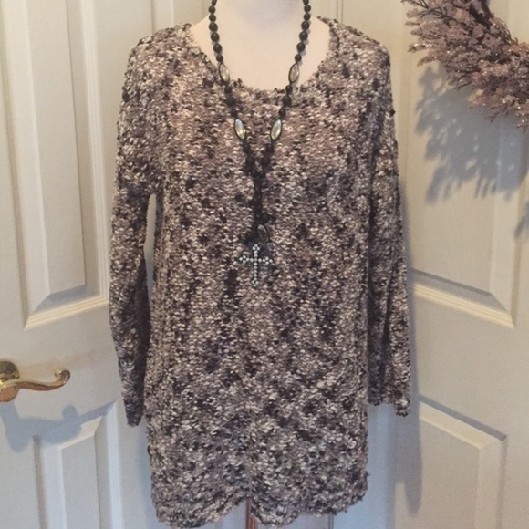 Soft sweater made of polyester and acrylic. Black, white and gray. Slit at side, hangs loose and comfy.