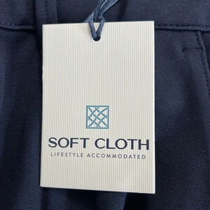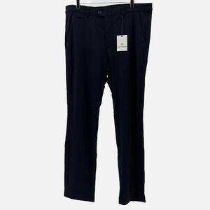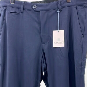 Soft Cloth Jersey Knit Flat Front Trousers in Navy - NWT - Size 38. New with brand tag, no price tag. Sold at Nordstrom. Soft knit, navy blue, 2 front pockets, one small coin/key pocket, 2 back welt pockets. Approximate measurements: 19 1/2" waist, 12" rise, 33" inseam.