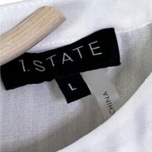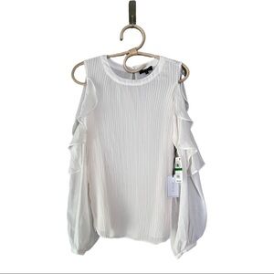Check out this gorgeous chiffon blouse from 1.STATE! It’s called Style 8151000 and it’s called Golden Daze in Soft Ecru Ruffle Cold Shoulder Pleat Blouse. The ruffle trim and cold-shoulder cutouts add a touch of easy glamour, while the billowy pleats make it look super feminine. It’s brand new with tags and comes in a lovely soft ecru color. It’s also 27 1/2 inches long, has a crew neck, long cold-shoulder sleeves, and a keyhole back with a fabric button