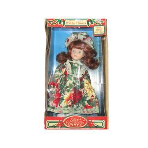 From Simple Expressions is a 12-inch porcelain doll from their holiday classics series.  The doll is attired in a long floral dress in holiday hues of white, green, and red. The dress is accented with white lace trim.  She is wearing a matching kerchief. Last, she is wearing white laced shoes.  Doll stand included.