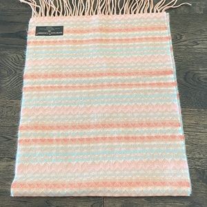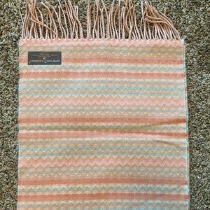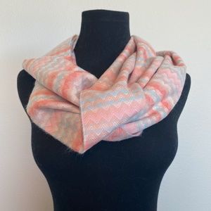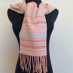Softer than Cashmere! Fringe-hem Scarf, OS, New in package. Scarf is peach with hints of pink and blue zig zag design -100% acrylic. 66” long x 12” wide