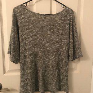 Soft material, slightly off the shoulder, gray with a subtle graphite design.