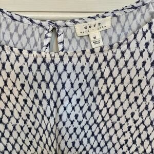 Comfy casual Soft Joie dress features elastic waist detail, slight ruffling at hem, pretty 3/4 length blouse sleeves. Navy blue and white print. Light and comfortable dress.