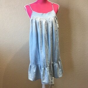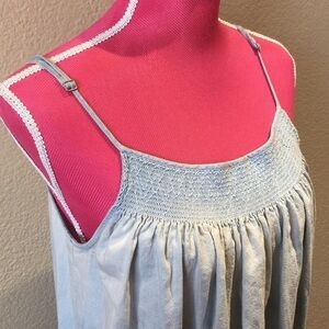 Ombre shift dress. Smocked elastic panel at the neckline. Adjustable shoulder straps. Unlined. Fabric: chambray. Shown in multiple stock photos for atyling ideas. Excellent condition. Minimal store wear.