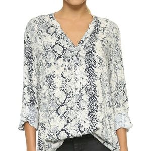 Snake-print "Dane" blouse by Soft Joie. V neckline; button front. Long button-tab sleeves. Relaxed fit. Shirttail hem. Rayon. Size XXS.