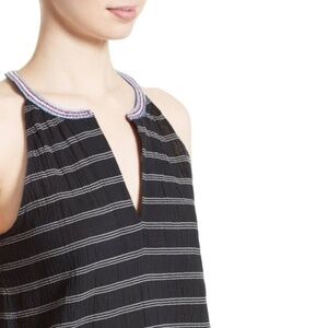 Embroidered accents at the collar and hem, along with slender embroidered stripes,