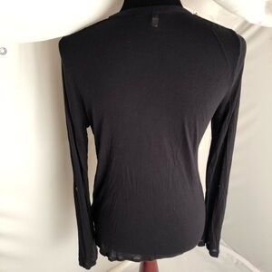 Soft Joie black sheer flowy v-neck top. Super soft, comfortable, & flattering. Casual but sexy. Throw on with jeans and a cardigan! There is the smallest hole- pictured in the last photo- it’s really hard to see but I lightened the photo and circled it. Just in respect of full disclosure. Smoke free home