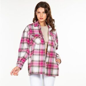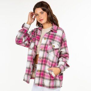 Soft Knit Oversized Button Down 4 Pocket Shacket Plaid Flannel Pink