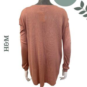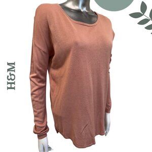 This H&M light burnt orange long sleeve sweater is the perfect lightweight layering piece. Designed with a relaxed silhouette and soft knit texture, it’s ideal for transitional seasons or everyday wear. The simple scoop neckline and subtle ribbed detailing make it effortlessly stylish and versatile. Whether worn solo or layered, it brings comfort and casual charm to any outfit.