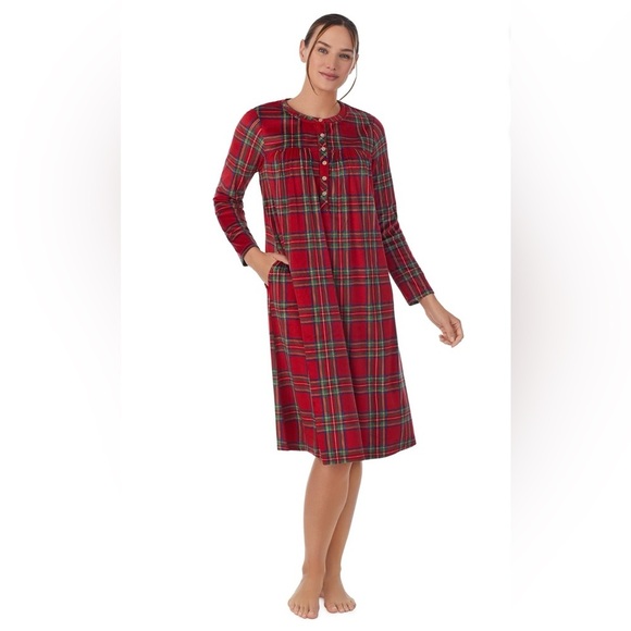 Soft Knit Velour Red Plaid Long Sleeve Flannel Nightgown Medium Christmas