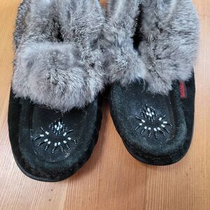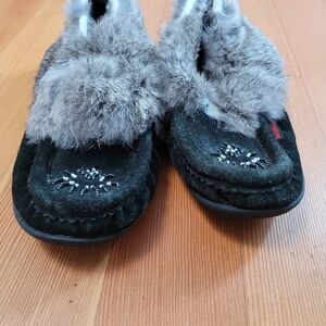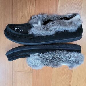 Soft Moc size 8 black & grey beaded moccasins real leather rabbit fur details. IN great pre owned condition with minimal wear on the insole and throughout as shown in photos.