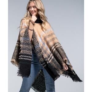 Soft Mocha Plaid Turtleneck Poncho Either Fringe Detail