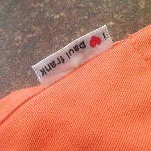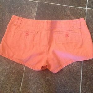 Cute Orange shorts with faux button pockets on back and angled pockets on front. Button closure.