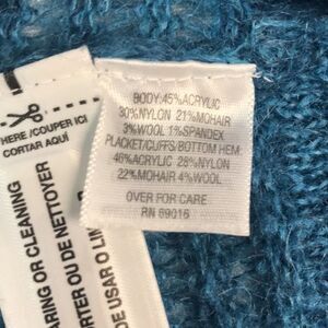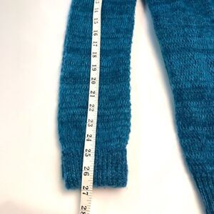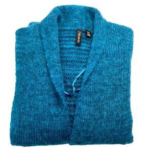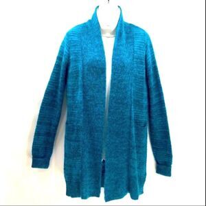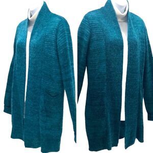 Relativity open front fine crochet cozy and soft knit long teal cardigan sweater. Beautiful teal color. 2 deep front pockets for glasses, phone, etc. Acrylic, nylon, mohair and wool blend that is so soft, comfortable & cozy.