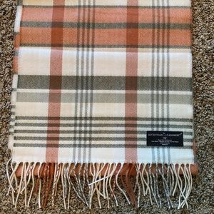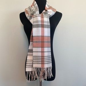 Softer than Cashmere! Plaid Fringe-Hem Scarf, new, One-Size, Peach & Gray - 100% Acrylic. 66” long x 12” wide.