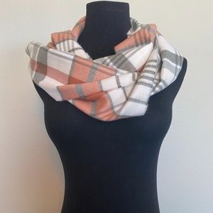 Soft!! Plaid Fringe-Hem Scarf, Peach & Gray, NWOT