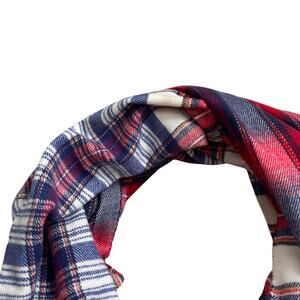 Super soft red, white, and blue plaid scarf with fringe on the ends